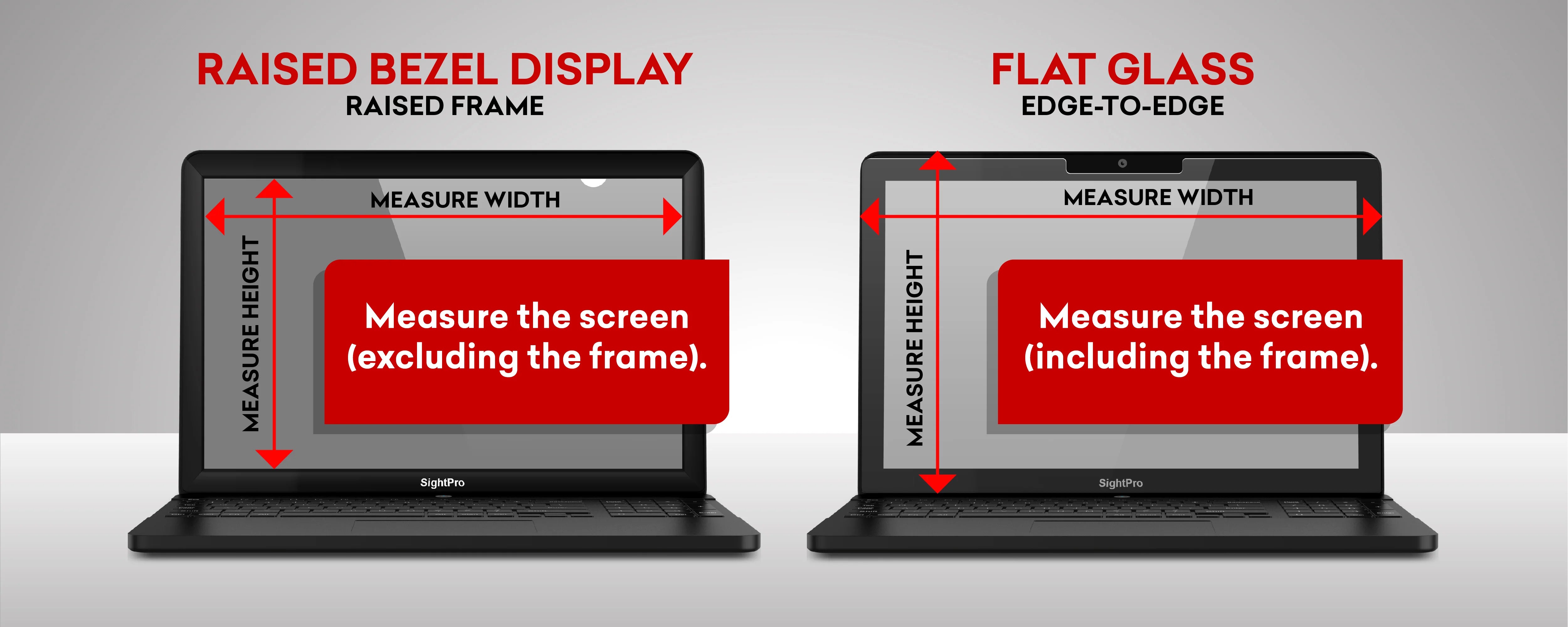 To measure your monitor for a privacy screen, first identify the screen type: Raised Bezel (with a frame) or Flat Glass (edge-to-edge without a frame). Measure the width and height of the display area only for Raised Bezel, and the entire glass surface for Flat Glass. Use a flexible measuring tape and refer to the Size Chart for guidance.